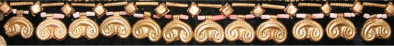 Основу орнаментальной композиции образуют бляшки, штампованные из тонкой золотой фольги с выпуклой серединой и с имитацией сканной проволочки по краю. Такие выпуклые, полые изделия создавали видимость массивных вещей при минимальной затрате металла.
