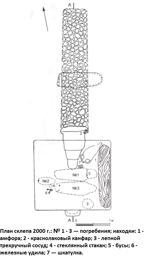 В целом относительно немногочисленный, но достаточно выразительный материал из склепа позволил предположить, что захоронения в нем могли быть совершены, скорее всего, не ранее второй четверти – начала – второй половины IV в., хотя совершенно исключить конец III в. все-таки не представляется возможным. Верхняя хронологическая граница погребений, по-видимому, не выходит за пределы IV столетия, приближаясь, вероятно, к его самому концу. По общему облику находки весьма напоминают материалы других погребений Крыма позднеримского времени. Склепы подобного типа были распространены в Юго-Западном Крыму достаточно широко (два недавно исследованных могильника, например, – Вишнёвое, «Бертье-Делагарда»).